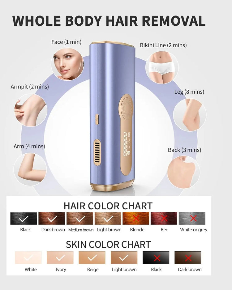 Not all hair and skin types are suitable for IPL treatment. Generally speaking, not work on blonde/red/white/grey hair or black and dark brown skin. IPL is safe for home hair removal