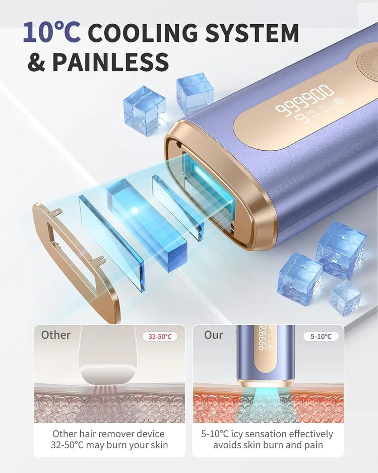 This upgraded laser hair removal device built-in 50℉(10℃) Refrigeration sheet, start cooling mode at power on, can cool the skin while emitting pulsed light with a painless ice-cool and comfortable experience.