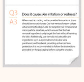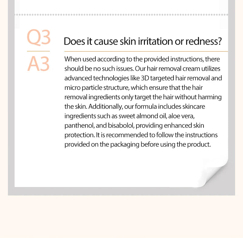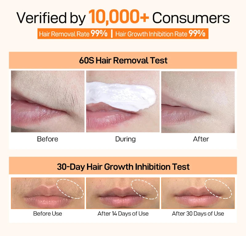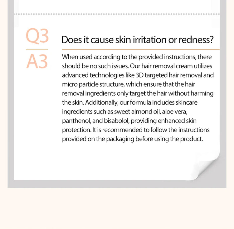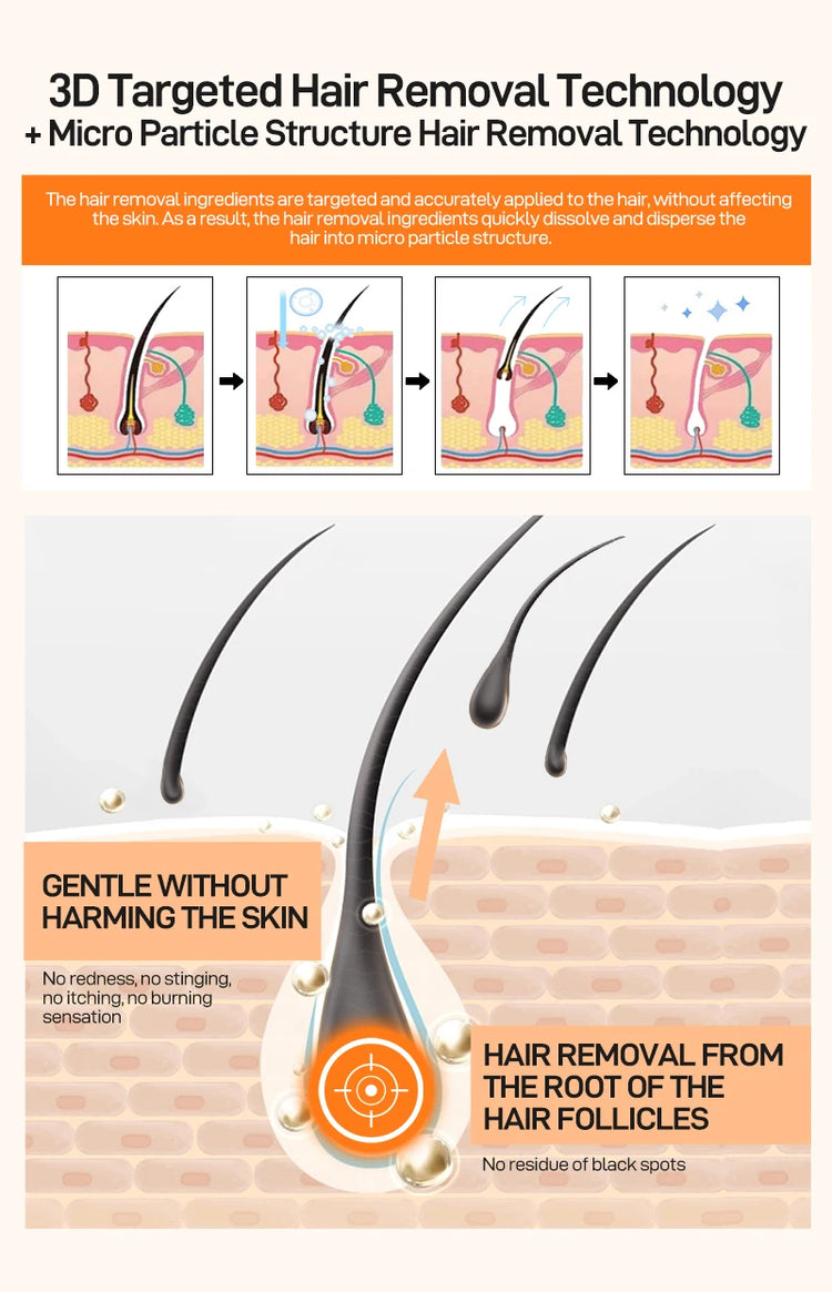 Adopting advanced 3D targeted hair removal technology, the hair removal ingredients are accurately applied to the hair, resulting in faster and more thorough hair removal without leaving any black spots. It is gentle and painless, without redness or burning.