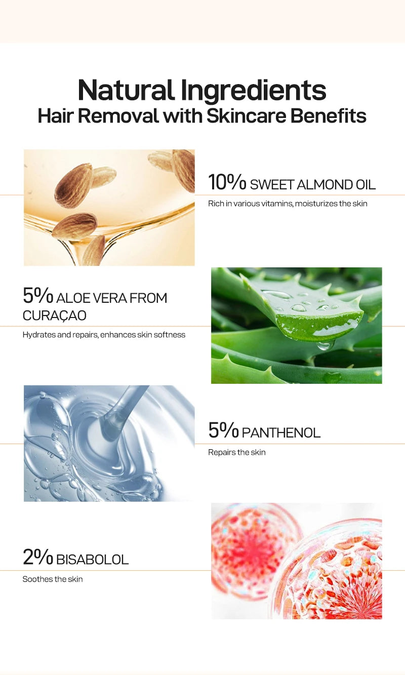Formulated with high-concentration sweet almond oil and aloe vera extract, it soothes and nourishes the skin during hair removal, making the skin fearless of pain, redness, and burning. After hair removal, the skin is soft, moisturized, delicate, and smooth.