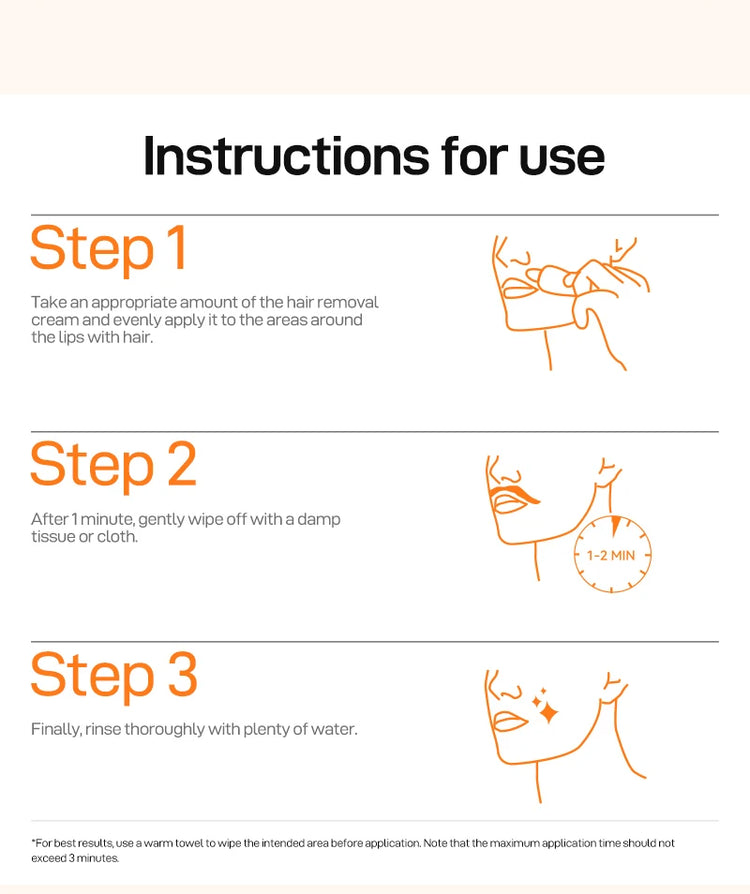 Take an appropriate amount of hair removal cream and apply it evenly to the area around the upper lip where hair is present. After 1-2 minutes, gently wipe it clean with a wet tissue or cloth, and finally rinse thoroughly with plenty of water. (Before use, wipe the applicable area with a warm towel for better results. Note that the maximum usage time should not exceed 3 minutes.)